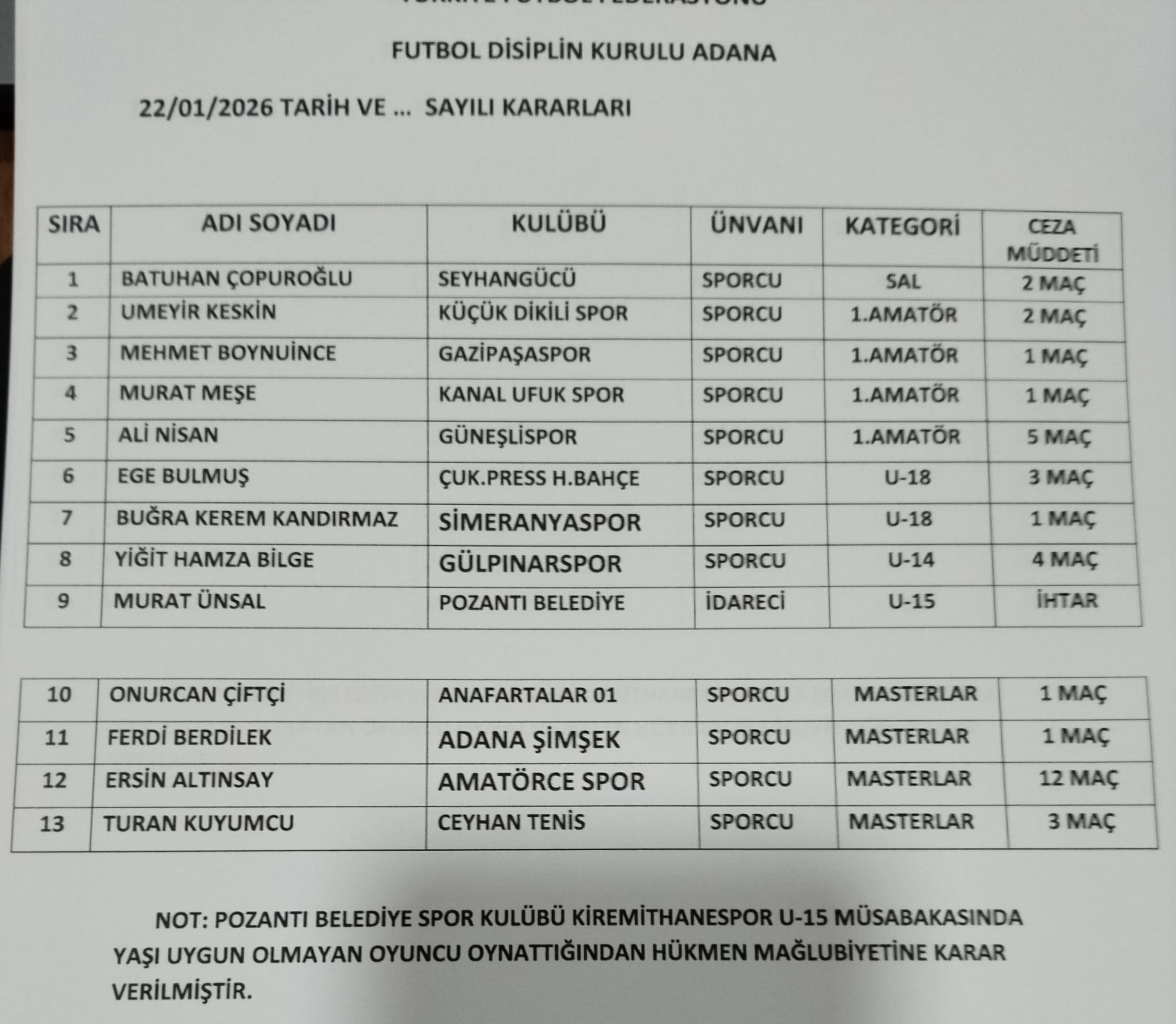 15 01 2026 İLDİSİPLİN KURULU KARARLARI