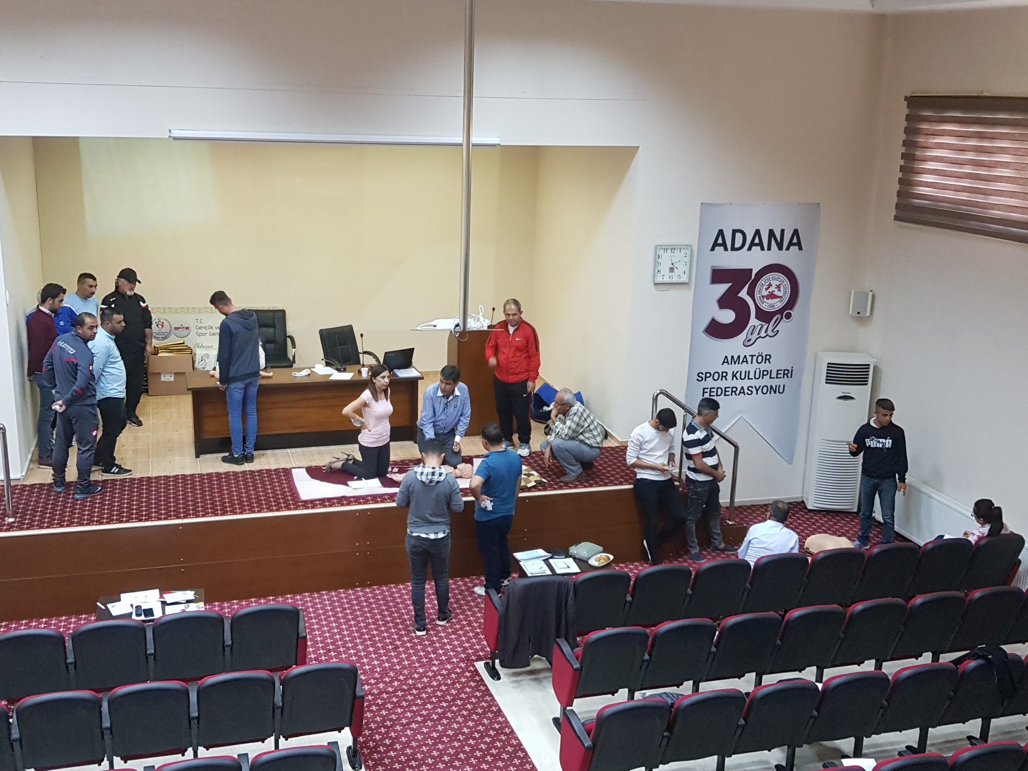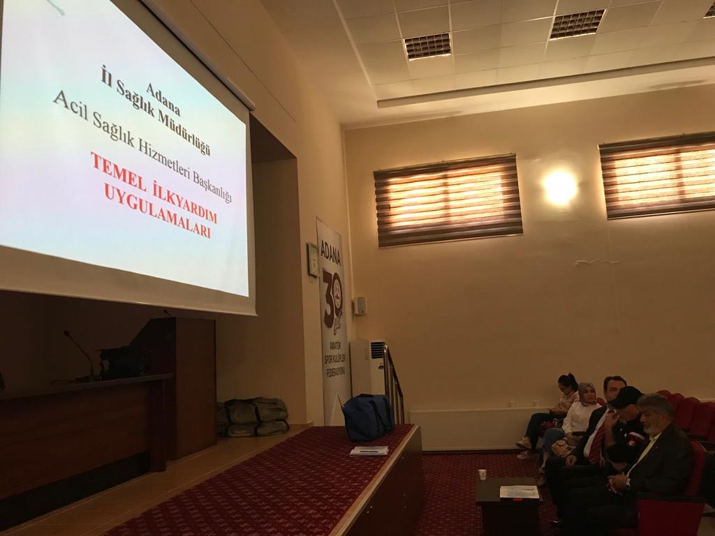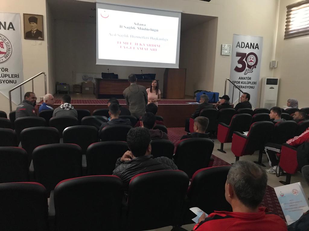 Adana ASKF ile Sağlık İl Müdürlüğü katkılarıyla perifer sahalarda ve diğer sahalarda müsabaka sağlıkçısı olarak görev yapması planlanan kişilere Tahir Boğa İlkyardım Eğitim Kursu Adana ASKF Ali Gülleri Spor Merkezi Toplantı Salonunda yapıldı.
