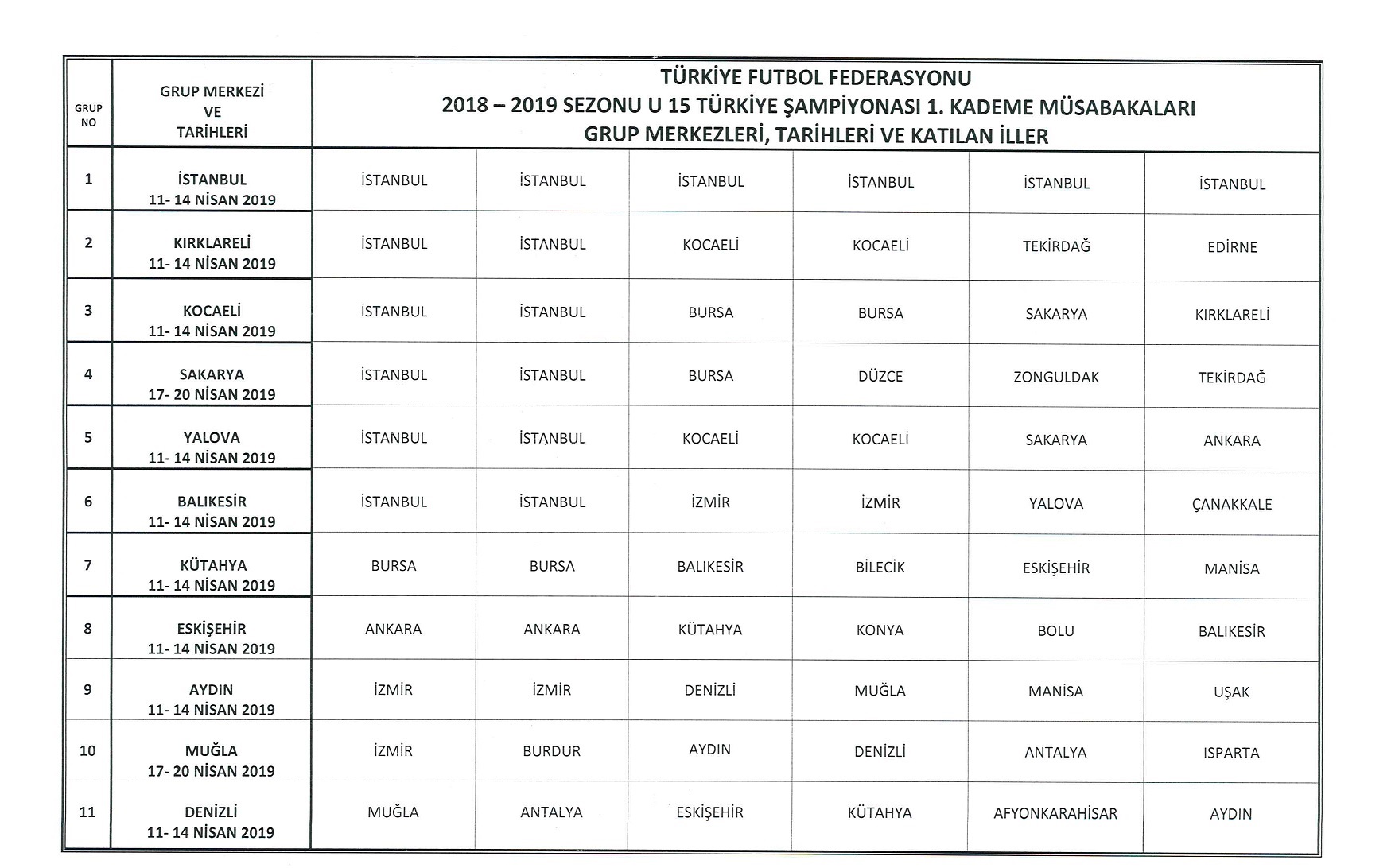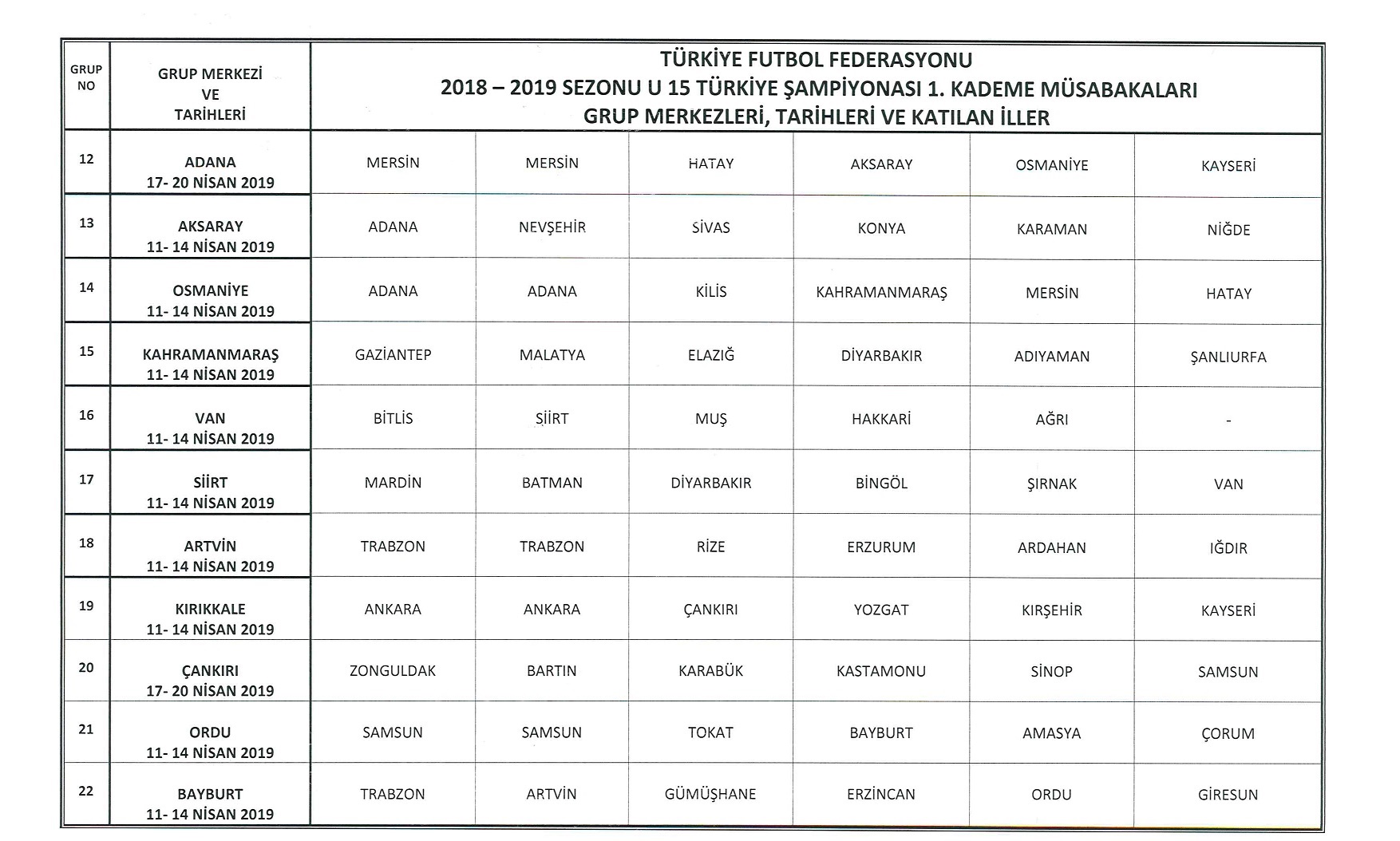 - 2018 – 2019 sezonu U15 Türkiye Şampiyonası 1. Kademe Müsabakaları 78 ilden 131 takımın katılımı ile 6’şar takımlı 17 grupta ve 5 takımlı 1 grupta 11- 14 Nisan 2019, 4 grupta 17-20 Nisan 2019 tarihlerinde olmak üzere toplam 22 tarafsız grup merkezinde oynanacaktır.