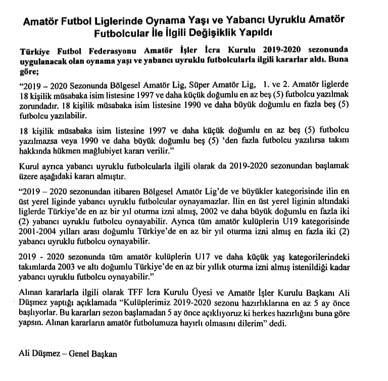 Türkiye Futbol Federasyonu Amatör İşler İcra Kurulu 2019-2020 sezonunda uygulanacak olan oynama yaşı ve yabancı uyruklu futbolcularla ilgili kararlar aldı. Buna göre;