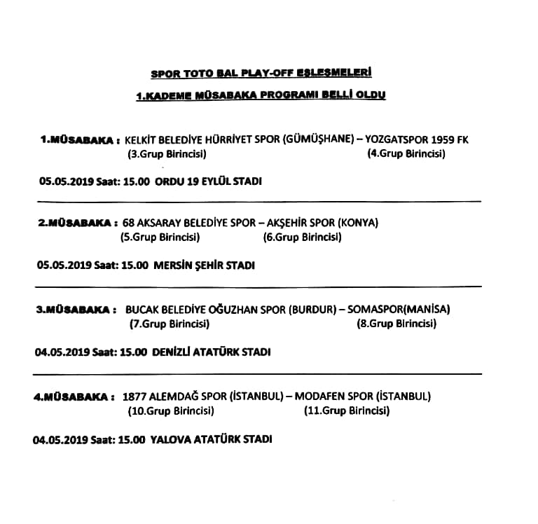 1.Kademe müsabakaları 4-5 Mayıs 2019 tarihlerinde oynanacak. Play-Off 2.Kademe müsabakaları 11-12 Mayıs 2019, 3.Kademe müsabakaları ise 18-19 Mayıs 2019 tarihlerinde oynanacak.