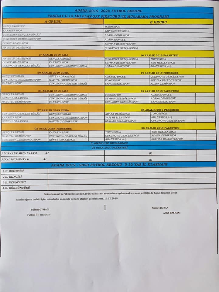 Adana Amatör Spor Kulüpleri Federasyonu Ali Gülleri Spor Merkezi Toplantı Salonunda gerçekleşen kura çekimi ile U-12 Yaş Yeşilay Play Off Ligi start aldı.
