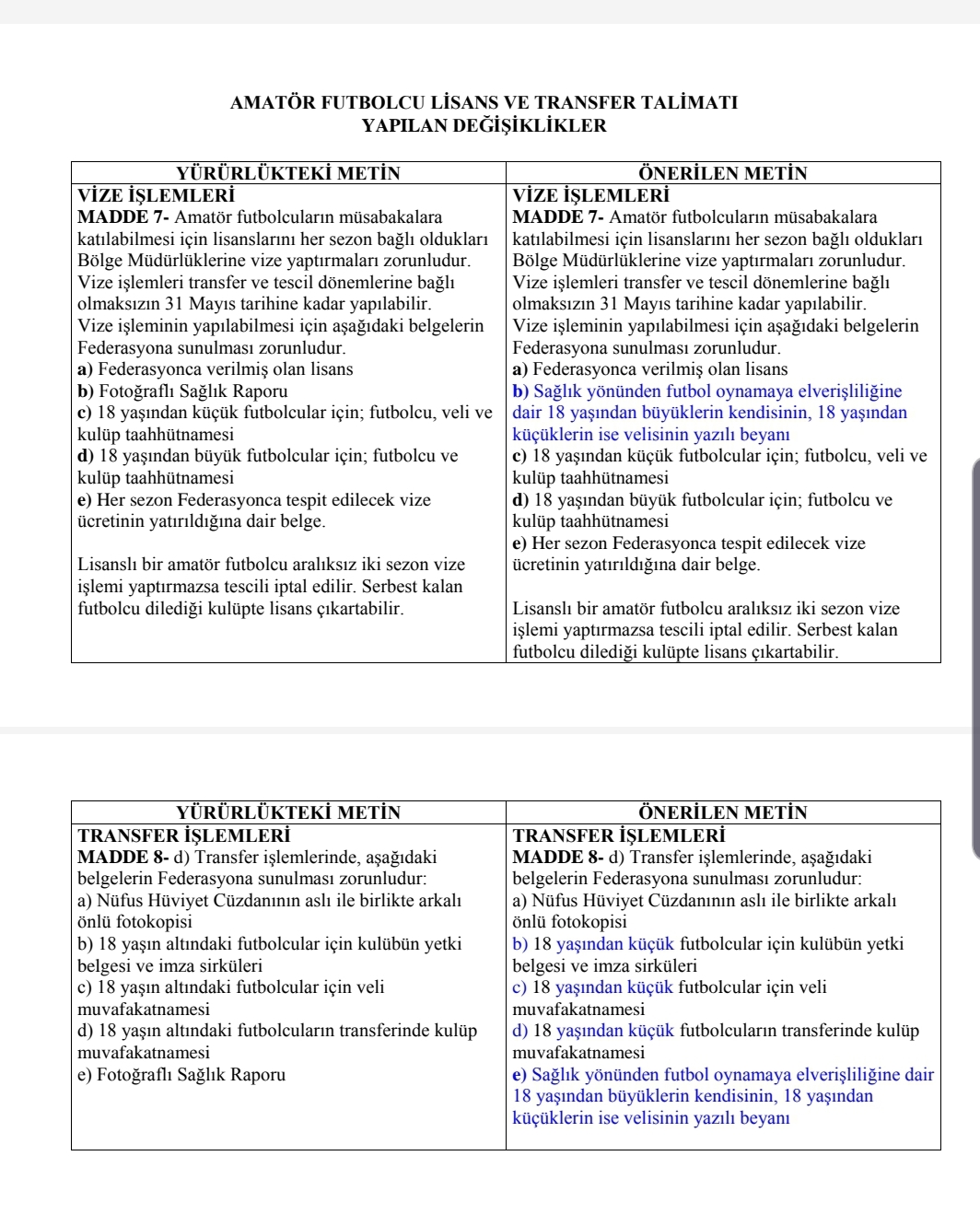 AMATÖR Futbolcu Lisans ve Transfer Talimatında yapılan değişiklik ile İlgili Ekler.
