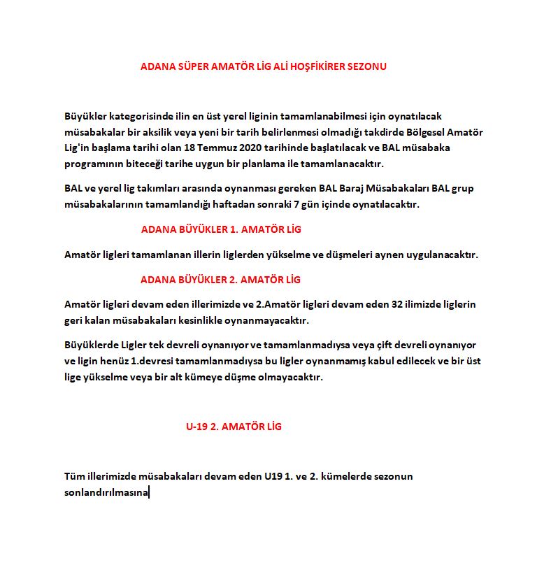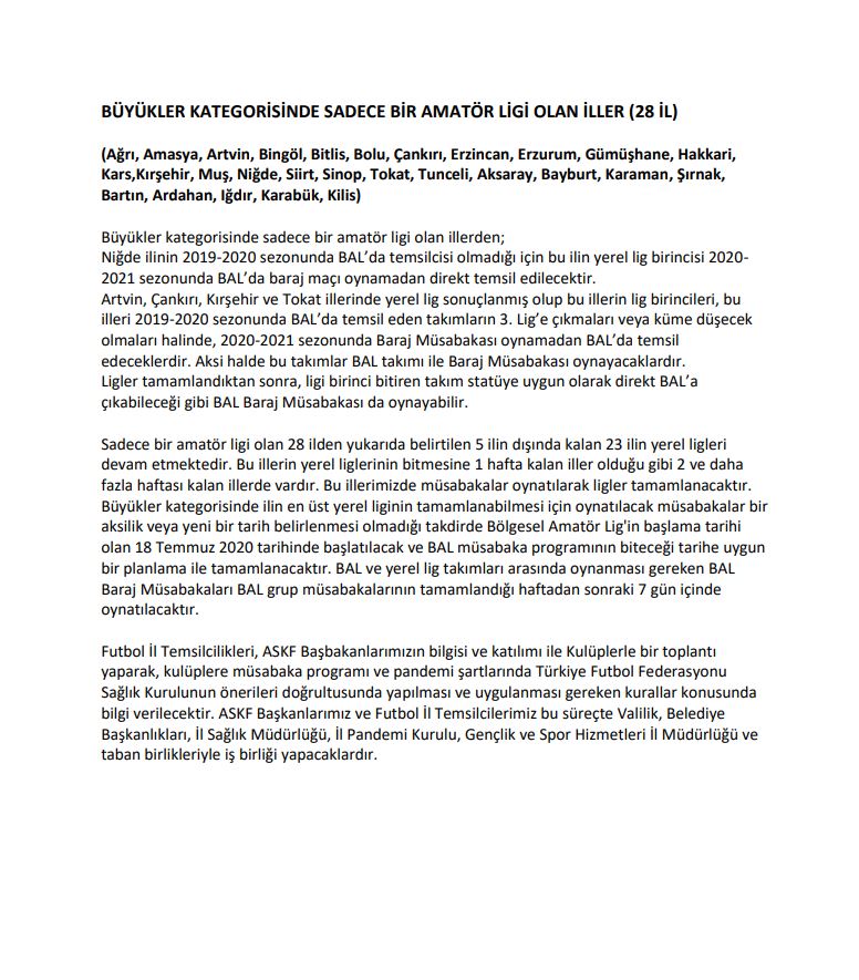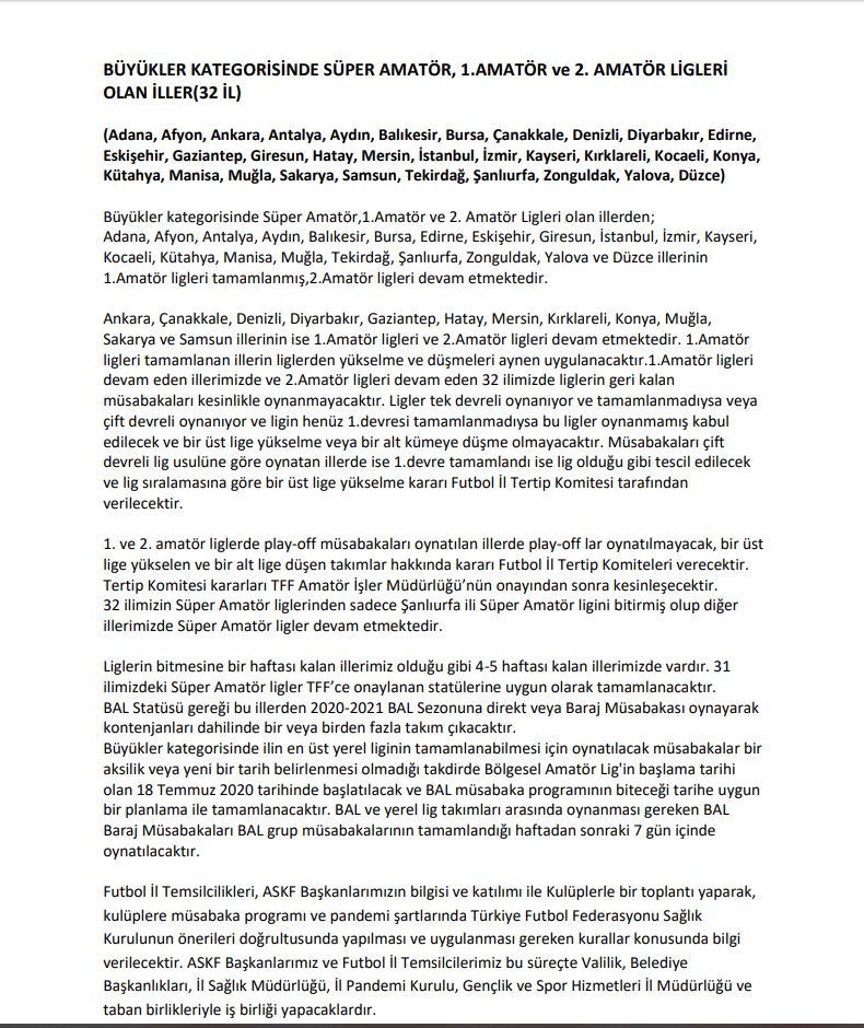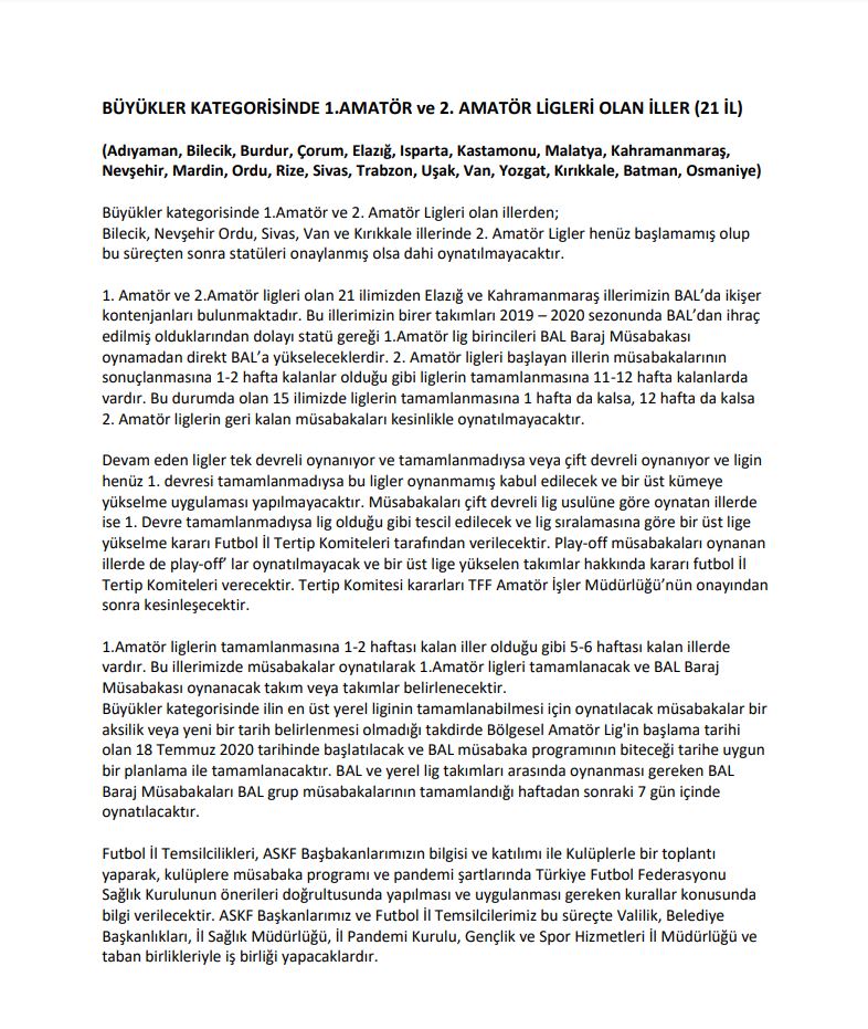 İlimizde devam etmekte olan ve sonuçlanan ligler ile ilgili Türkiye Futbol Federasyonu'nun Pandemi Döneminde aldığı karar neticesinde oluşan tablo aşağıda çıkarılmış olup Türkiye Futbol Federasyonu kararları da ekte sunulmuştur.