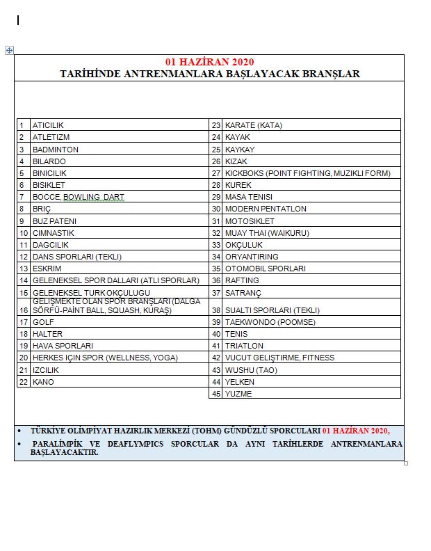 45 branşta antrenmanlar başlayacak