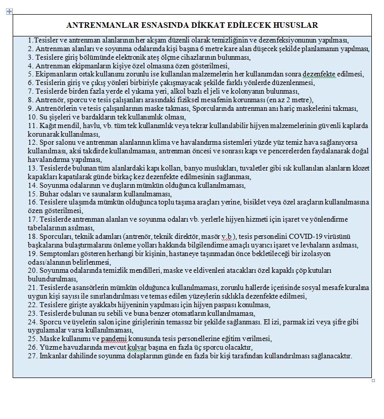 ‘’1.Tesisler ve antrenman alanlarının her akşam düzenli olarak temizliğinin ve dezenfeksiyonunun yapılması,