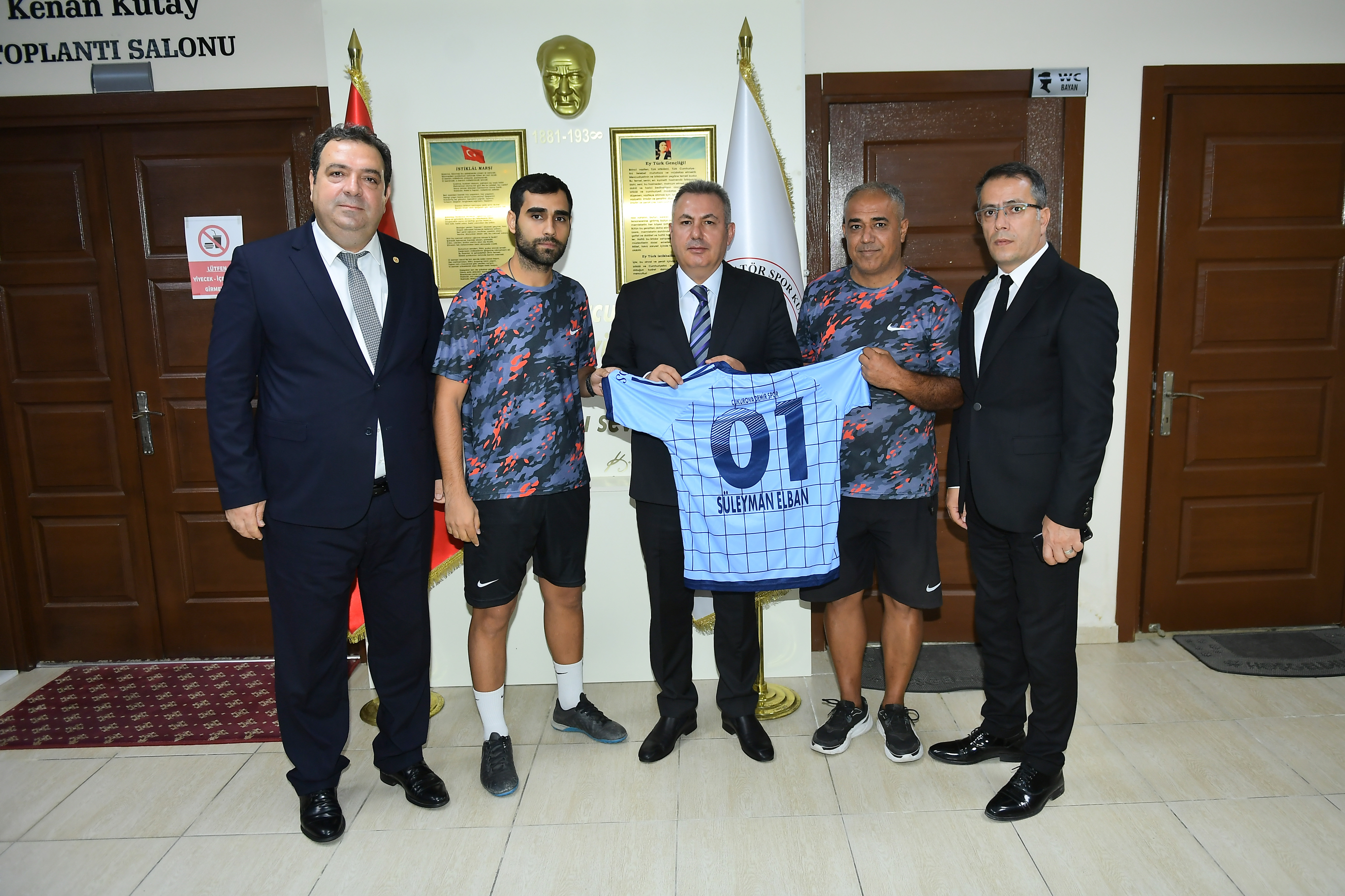 Cukurava Demirspor Kulübü Antrenörleri Gökmen Tekin ve Seyhun Can tarafından Vali Elban'a forma hediye edilerek, spor tesislerine verdikleri destekleri için teşekkür edildi.