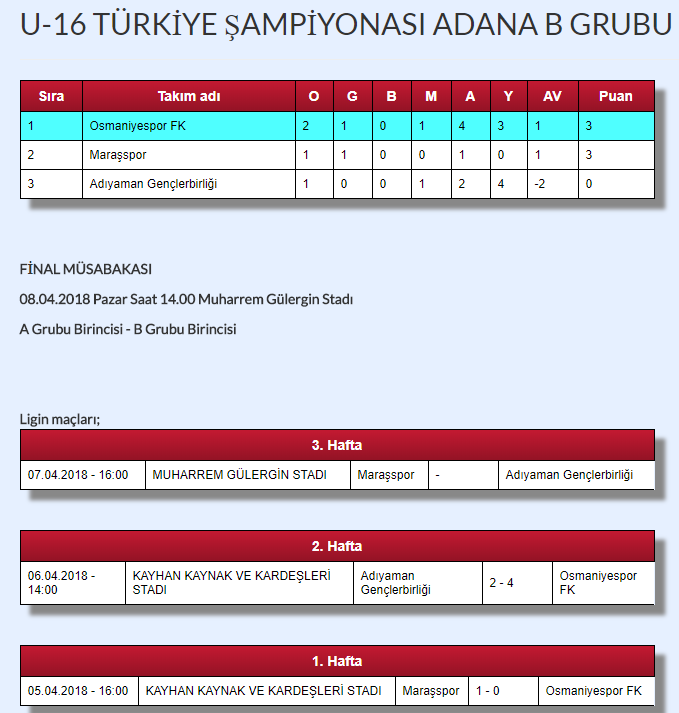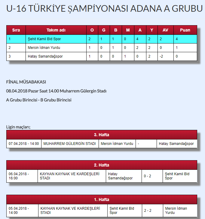 U-16 Türkiye Şampiyonası 1. Kademe Adana Grubu müsabakaları 05.04.2018 Tarihinde Kaynak Kardeşler Stadında start aldı.