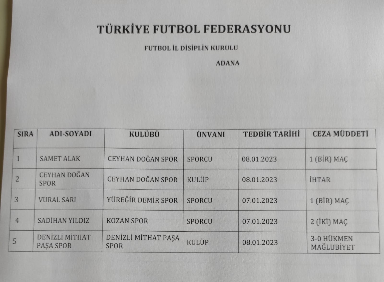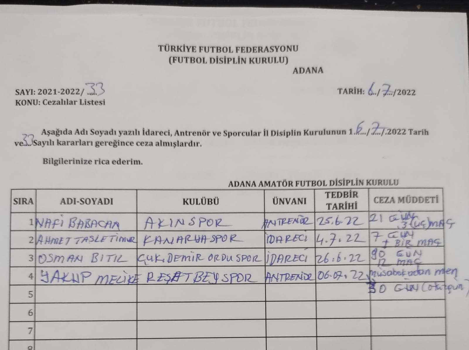 23.02.2022 DİSİPLİN KURULU CEZA LİSTESİ