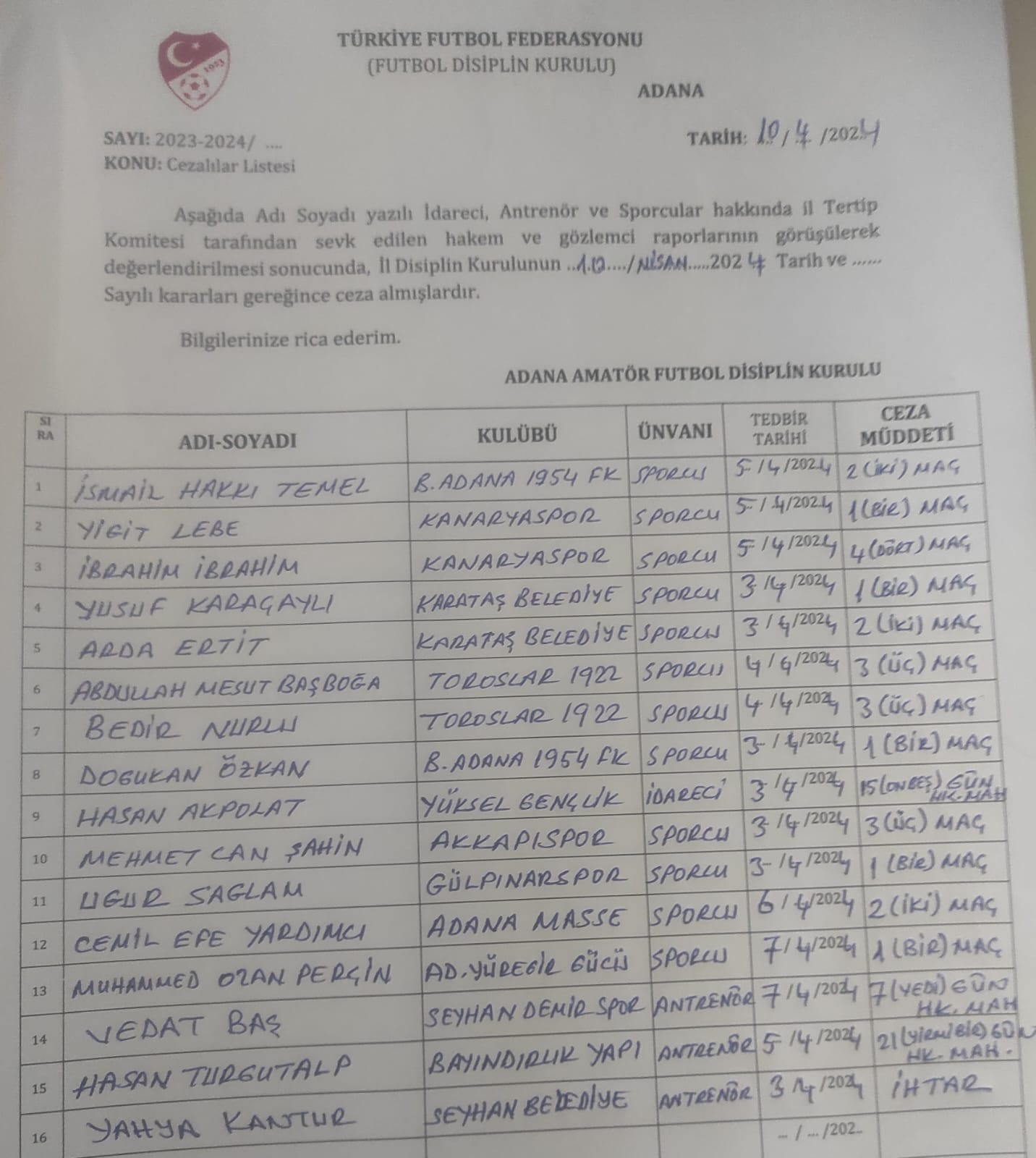TFF _DİSİPLİN CEZALILAR_10.04.2024 KARARLARI