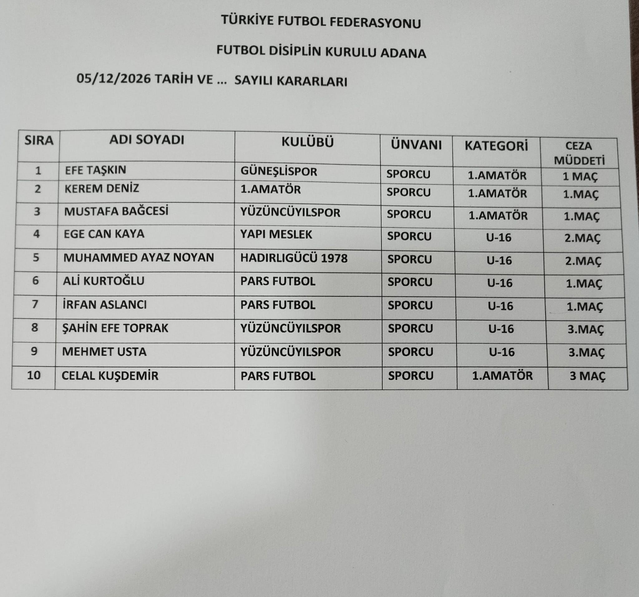05 MAYIS İL DİSPLİN KURULU KARARLARI